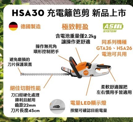 HSA 30 是一款容易上手的籬笆剪,含電池重量僅2.2kg,操作輕巧無負擔。